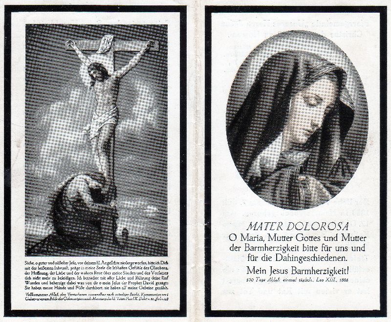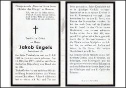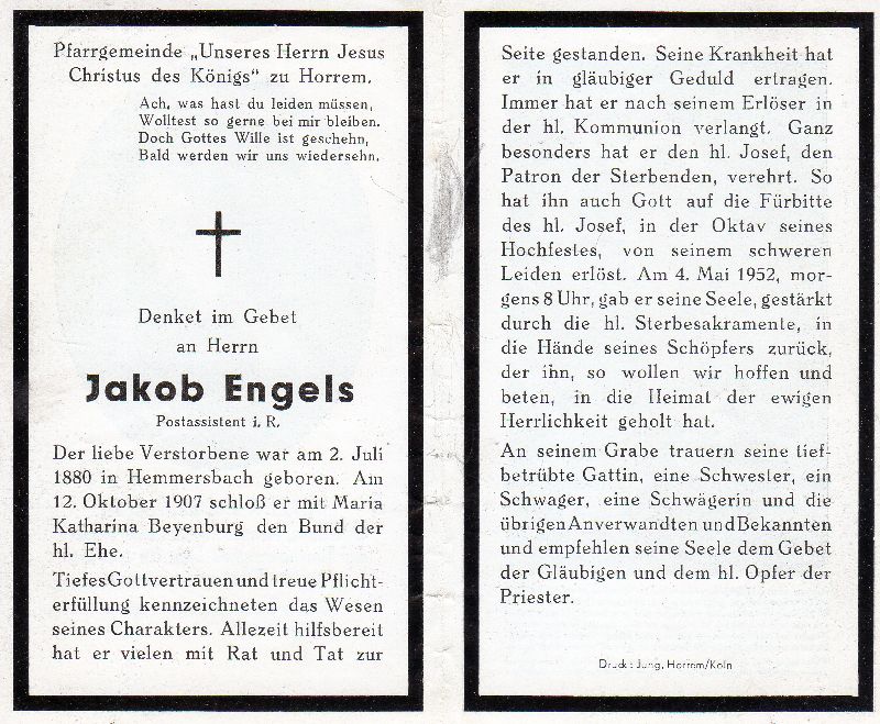 Postassistent i. R.; ∞ 12.10.1907 Maria Katharina Beyenburg; schweres Leiden; Druck in Horrem |