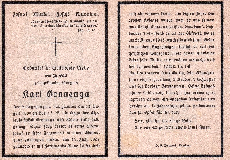 Gefallener 2. Weltkrieg; Eltern: Jakob Gronenga u. Maria Anna geb. Fahrig; verlor früh seine Eltern; ∞ 11.6.1937 Ferdinande Klaus aus Habbelrath; seit de. 1.9.1944 als Soldat an der Ostfront; 1 Sohn; Heimatpfarre Habbelrath |
