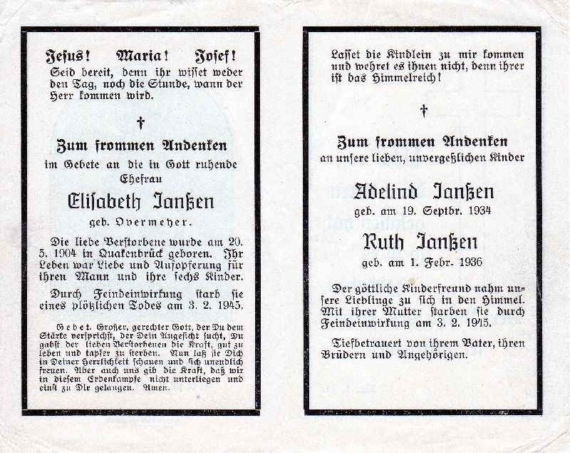 Opfer 2. Weltkrieg; starb mit Mutter Elisabeth Janßen (*20.5.1904) und Schwester Adelind (*19.9.1934) durch Feindeinwirkung |