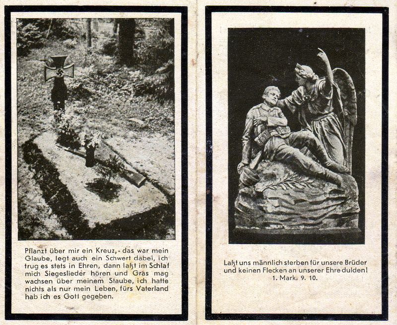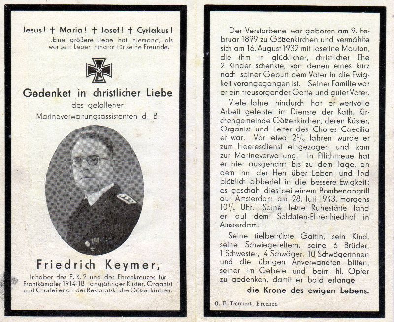 Gefallener 2. Weltkrieg; langjähriger Küster, Organist u. Chorleiter in Götzenkirchen; ∞ 16.8.1932 Josefine Mouton; 2 K., davon 1 kurz nach der Geburt †; vor 2 1/2 Jahren zum Heerediest: Marineverwaltung; Tod bei Bombenangriff auf Amsterdam; Soldatenfriedhof in Amsterdam; Druck in Frechen |