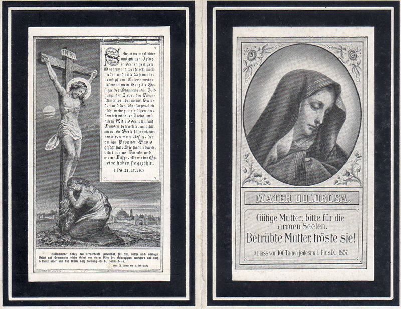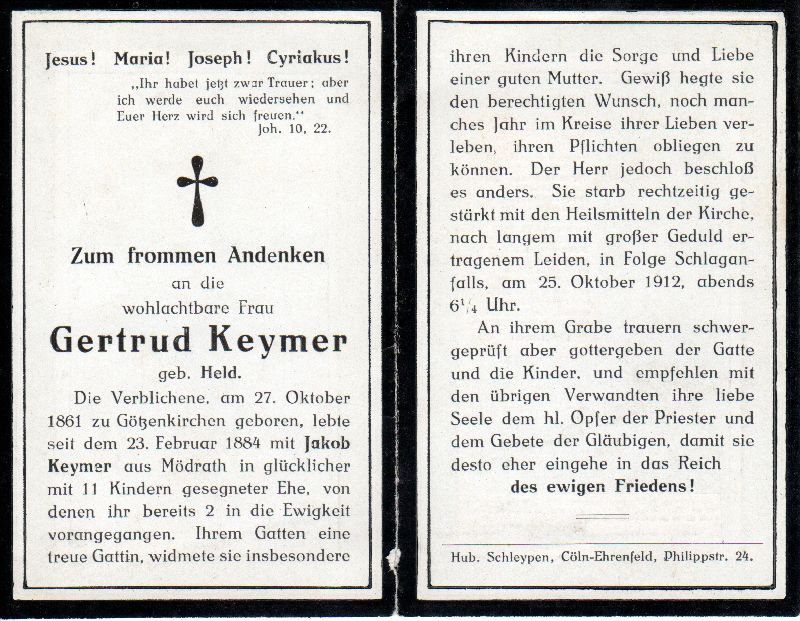 Schlaganfall; ∞ 23.2.1884 Jakob Keymer aus Mödrath; 11 K., davon 2 †; langes Leiden; Druck in Köln-Ehrenfeld |