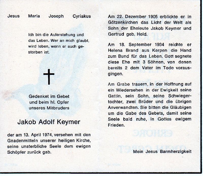 Eltern: Jakob Keymer u. Gertrud geb. Held; ∞ 18.9.1934 Helena Brand aus Kerpen; 3 Söhne, davon 2 † |
