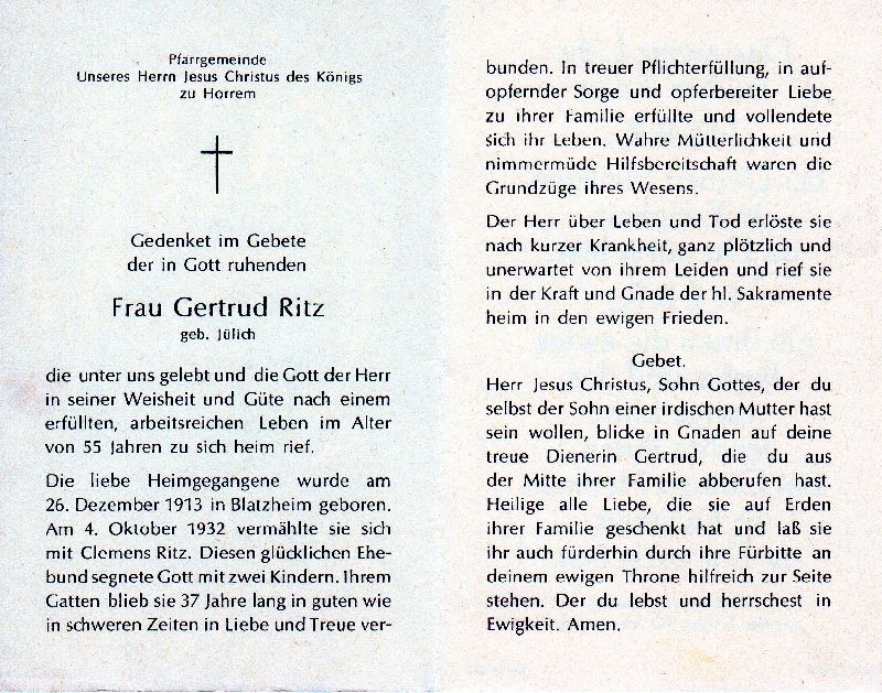 55 J.; ∞ 4.10.1932 Clemens Ritz; 2 K.; Pfarrgemeinde Horrem |