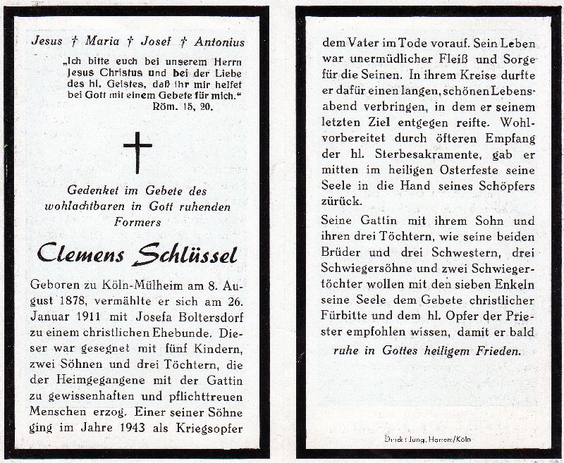 ∞ 26.1.1911 Josefa (Sophie) Boltersdorf; 5 K.; 1 Sohn im 2. Weltkrieg 1943 gefallen; schöner Lebensabend im Kreis der Familie; Druck in Horrem |