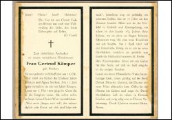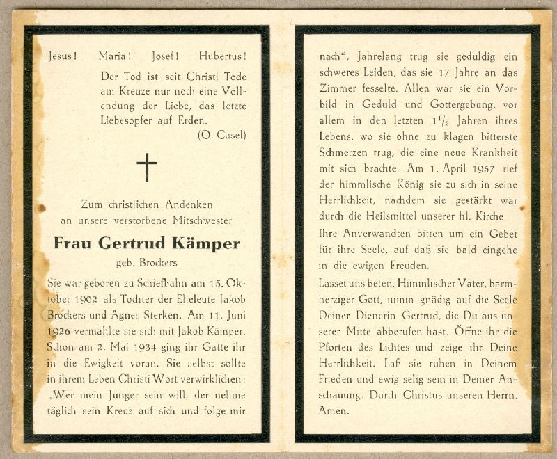| Eltern: Jakob Brockers u. Agnes geb. Sterken; ∞ 11.6.1926 Jakob Kämper, † 2.5.1934; schweres Leiden, 17. J. an das Zimmer gefesselt; in den letzten 1 1/2 J. neue, sehr schmerzhafte Krankheit; Wohnort: Schiefbahn |
