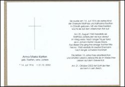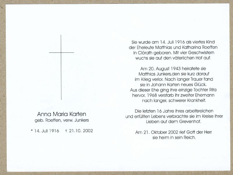 | Eltern: Matthias u. Katharina Roeffen; ∞ 20.8.1943 Matthias Junkers, kurz darauf im 2. Weltkrieg gefallen; ∞ Johann Karten, † 1968; 1 Tochter Rita; |