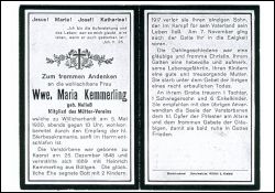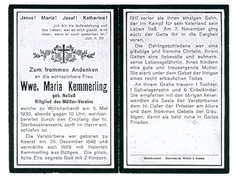 | Mitgl. Mütterverein; ∞ 1889 Heinrich Kemmerling aus Büttgen, † 7.11.1918; 2 K., davon 1 Sohn 1917 im 1. Weltkrieg gefallen; Druck in Willich |