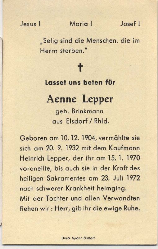 ∞ 20.9.1932 Kaufmann Heinrich Lepper, † 15.1.1970; 1 überlebende Tochter; Druck in Elsdorf |