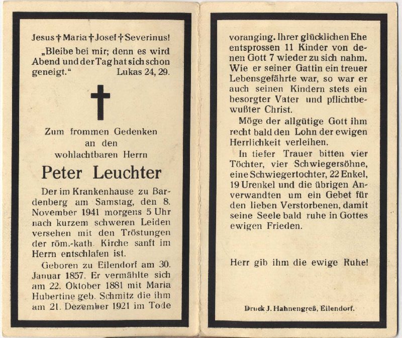∞ 22.10.1881 Maria Hubertine Schmitz, † 21.12.1921; 11 K., davon 7 †; Druck in Eilendorf |