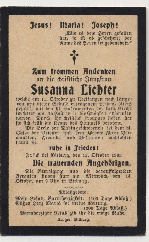 15 J.; längeres Leiden; Angehörige in Irsch b. Bitburg; Exequien in Bitburg |