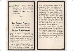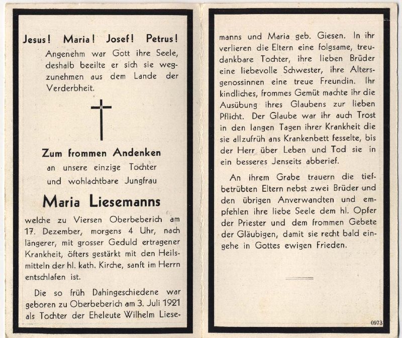Jungfrau; einzige Tochter von Wilhelm Liesemanns u. Maria geb. Giesen; 2 Brüder; lange Krankheit |