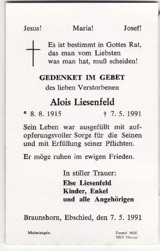 Ehefrau: Else Liesenfeld; Kinder; Angehörige in Braunshorn u. Ebschied |