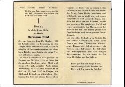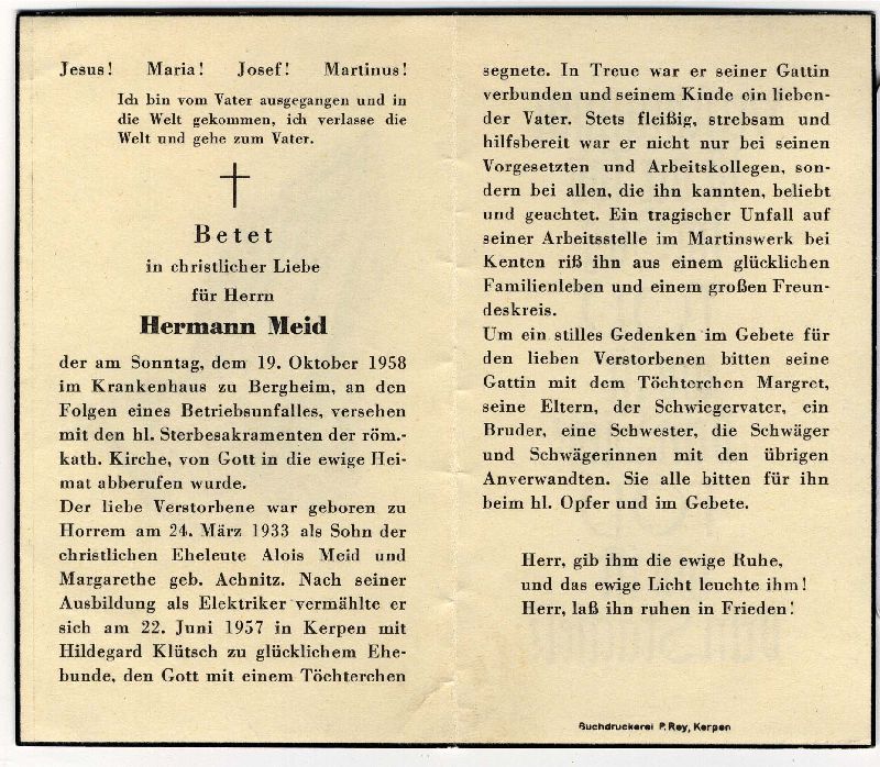 | Eltern: Alois Meid u. Margarethe geb. Achnitz; Elektriker; ∞ 22.6.1957 in Kerpen Hildegard Klütsch; 1 Tochter; Tod durch Unfall an der Arbeitsstelle im Martinswerk b. Kenten |