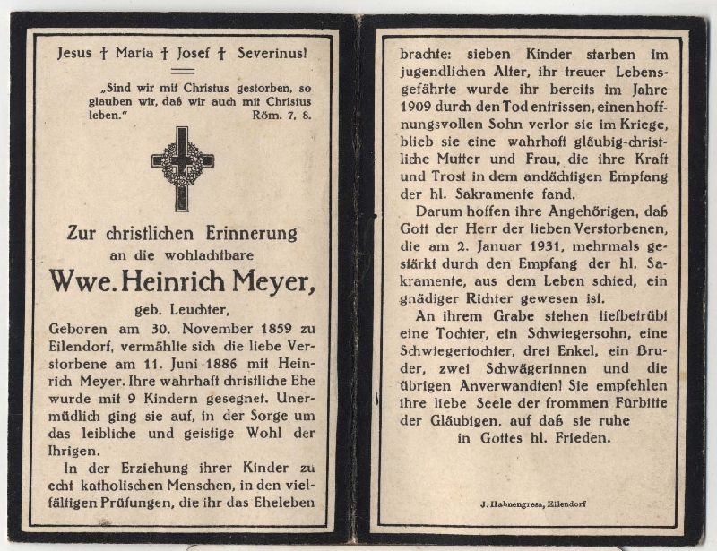 | ∞ 11.6.1886 Heinrich Meyer, † 1909; 9 K., davon 7 jugendl. †; Druck in Eilendorf |