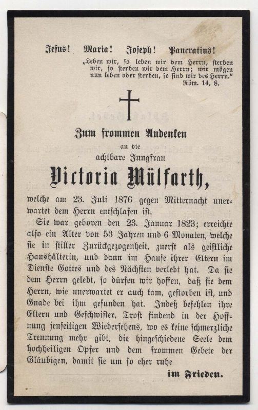 | Jungfrau; zuerst geistliche Haushälterin; dann im Haus ihrer Eltern |