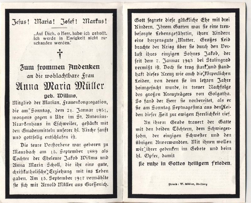 | Mitgl. Frauenkongregation; Eltern: Jakob Willms u. Anna Maria geb. Scholl; ∞ 15.9.1917 Arnold Müller aus Gressenich; 3 K.; Sohn Jakob im 2. Weltkrieg am 7.1.1943 bei Stalingrad vermisst; |
