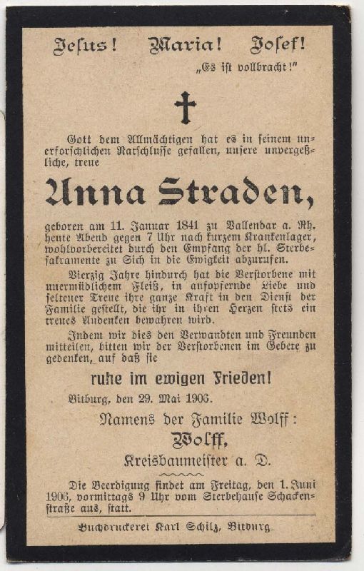 Hat sich 40 J. lang in den Dienst der Familie gestellt; namens der Familie Wolff: Kreisbaumeister a. D. Wolff |