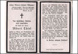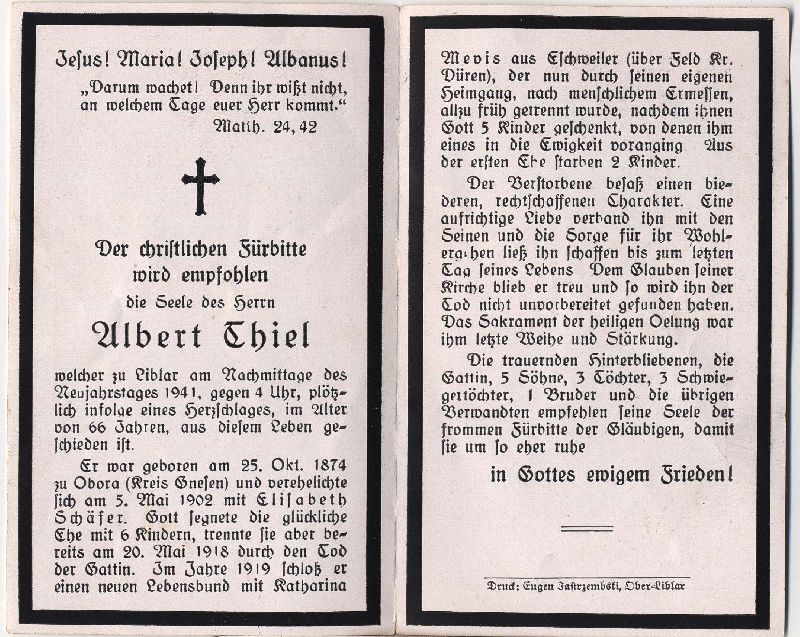 Herzschlag; ∞ 5.5.1902 Elisabeth Schäfer, † 20.5.1918; 6 K., davon 2 † ; ∞ 1919 Katharina Mevis aus Eschweiler (über Feld Kr. Düren); 5 K., davon 1 †; Druck in Ober-Liblar |