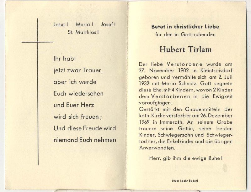 ∞ 2.7.1932 Maria Schmitz; 4 K., davon 2 †; Druck in Elsdorf |