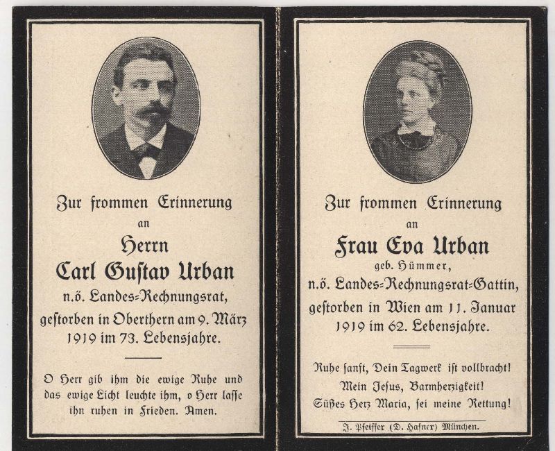 62 J.; ∞ Carl Gustav Urban, n. ö. Landes-Rechnungsrat; Druck in München |
