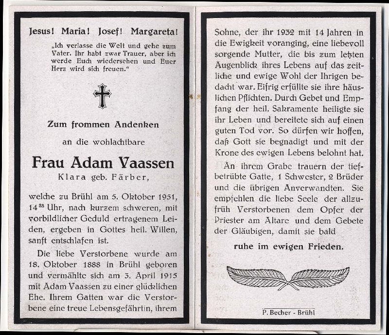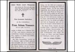 ∞ 3.4.1915 Adam Vaassen; 1 Sohn, der 1932 mit 14 J. †; |