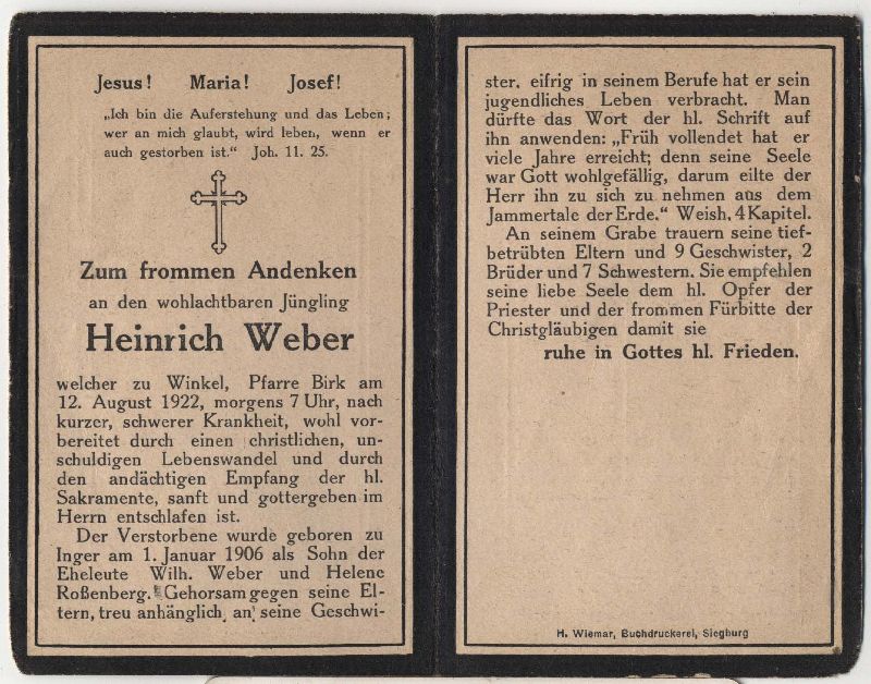 Eltern: Wilhelm Weber u. Helene geb. Roßenberg; Druck in Siegburg |