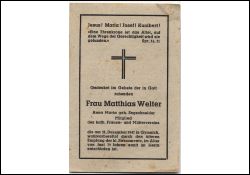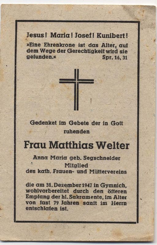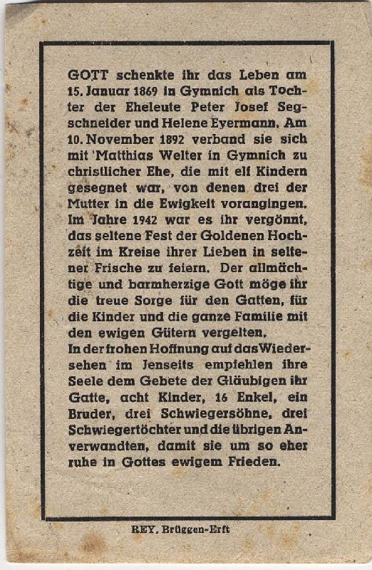 Eltern: Peter Josef Segschneider u. Helene geb. Eyermann; ∞ 10.11.1892 Matthias Welter in Gymnich; 11 K., davon 3 †; 1942 Goldhochzeit |