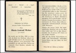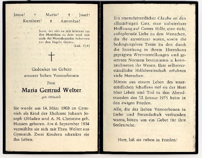 Eltern: Johann Joseph Obladen u. Anna Maria Christine geb. Hansen; ∞ 6.9.1934 Theo Welter aus Gymnich; 2 K. |
