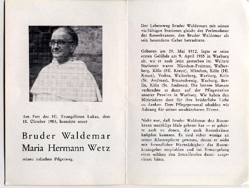 Erste Gelübde 9.4.1935 in Warburg; Stationen seines Lebens: München-Freiman, Köln (Hl. Kreuz), Vechta, Walberberg, Warburg, Köln (St. Andreas), Braunschweig, Warburg, Berlin, Köln (St. Andreas); zuletzt Pflegestation in Warburg |