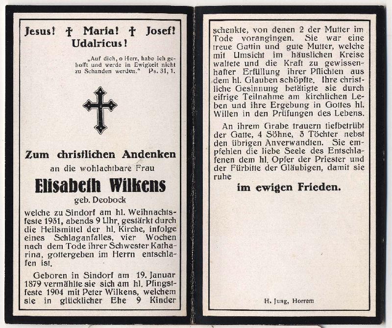 Schlaganfall; ∞ 1904 Peter Wilkens; 9 K., davon 2 †; |