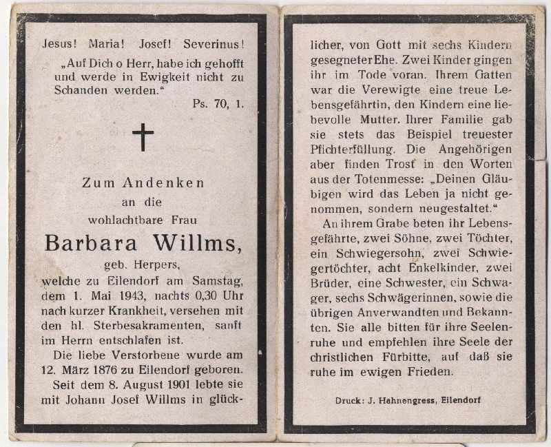 ∞ 8.8.1901 Johann Josef Willms; 6 K., davon 2 †; |