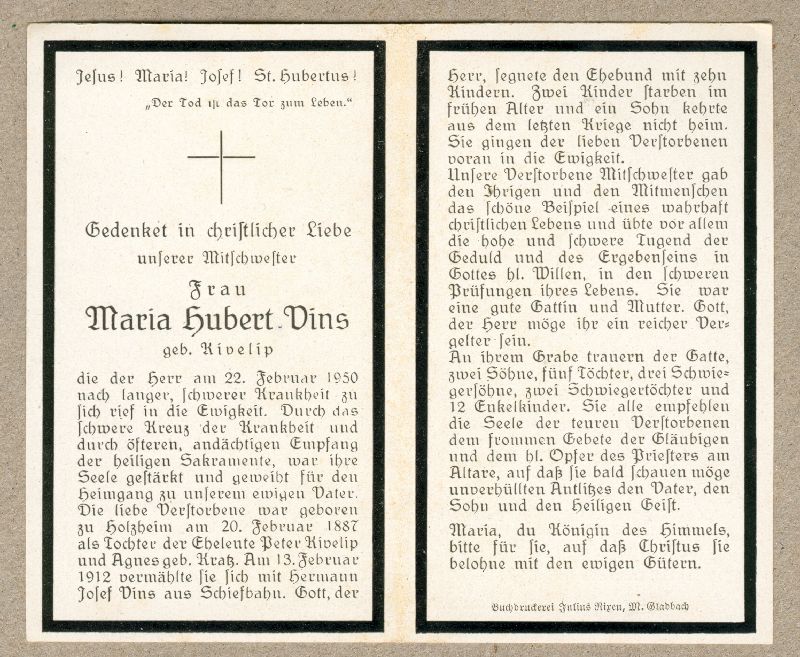 Lange, schwere Ktrankheit; Eltern: Peter Kivelip u. Agnes geb. Kratz; ∞ 13.2.1912 Hermann Josef Vins aus Schiefbahn; 10 K., davon 2 früh †, 1 Sohn im 2. Weltkrieg gefallen; Druck in Mönchengladbach |