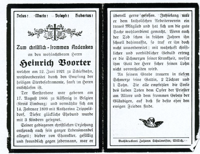 ∞ 14.2.1899 Katharina Trippelsdorf; 3 K.; Mitgl. kath. Arbeiterverein; Druck in Willich |