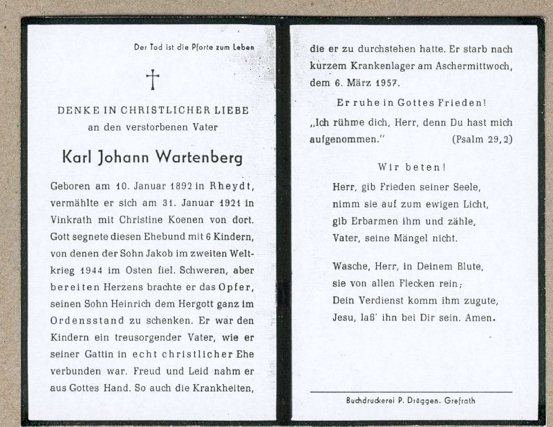 ∞ 31.1.1921 in Vinkrath Christine Koenen aus Vinkrath; 6 K., davon Sohn Jakob 1944 im Osten im 2. Weltkrieg gefallen; Sohn Heinrich trat in geistlichen Orden ein; Druck in Grefrath |