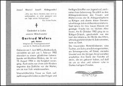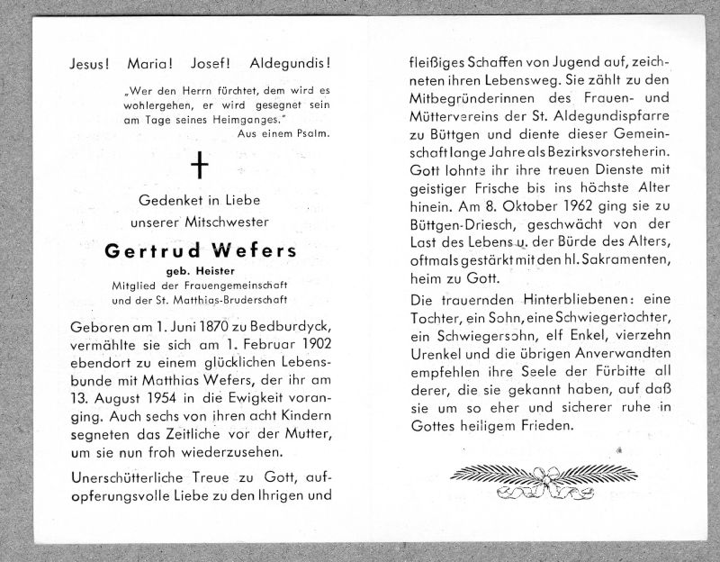 ∞ 1.2.1902 in Bedburdyck Matthias Wefers, † 13.8.1954; 8 K., davon 6 †; Mitbegründerin des Frauen- u. Müttervereins der St. Aldegundispfarre in Büttgen; |