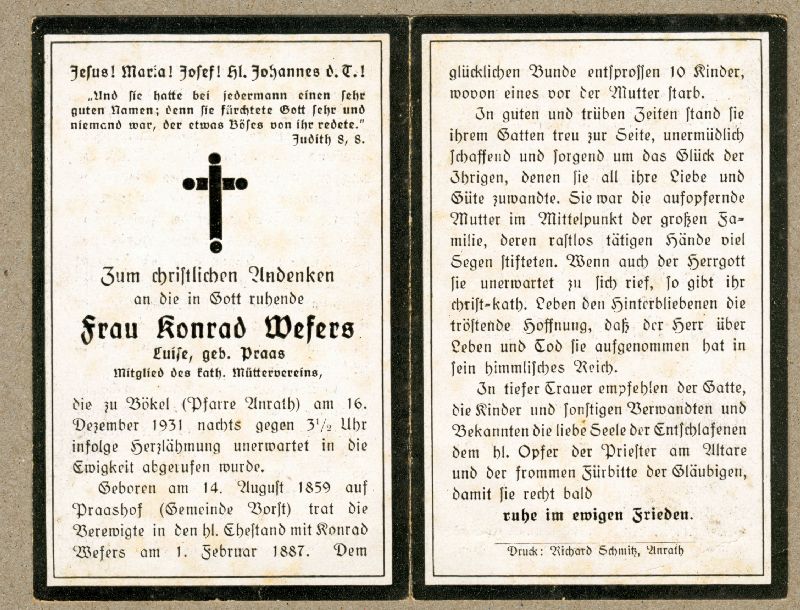 Herzlähmung; ∞ 1.2.1887 Konrad Wefers; 10 K., davon 1 †; Mitgl. Mütterverein |