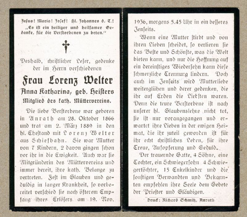 ∞ 2.3.1889 Lorenz Welter aus Schiefbahn; 7 K., davon 2 †; |