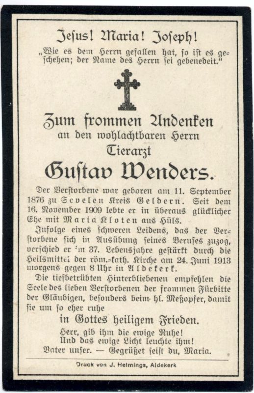 Tierarzt; ∞ 16.11.1909 Maria Kloten aus Hüls; schweres Leiden, zugezogen in Ausübung des Berufs |