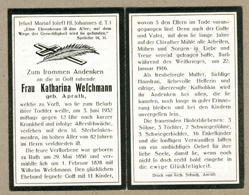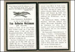 | Gestorben während des Besuches bei der Tochter; ∞ 1.2.1878 Wilhelm Weschmann, † 22.1.1916; 11 K., davon 5 †; |