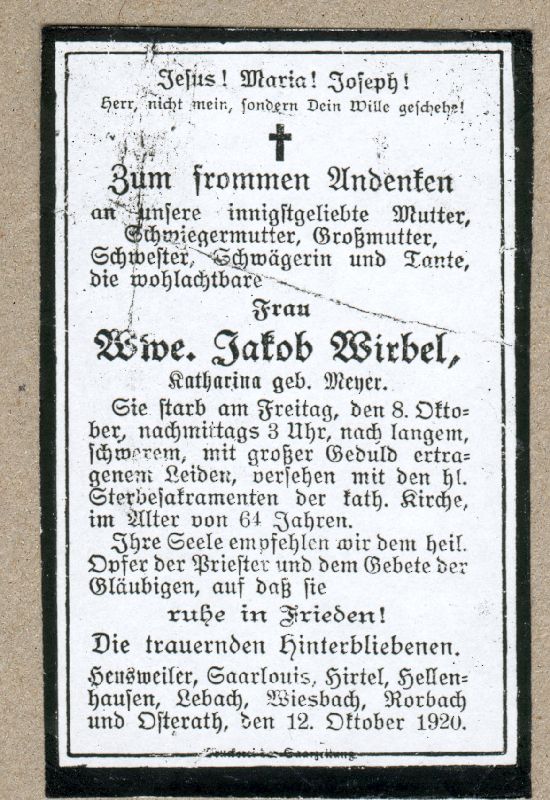 64; langes, schweres Leiden; ∞ Jakob Wirbel, †
