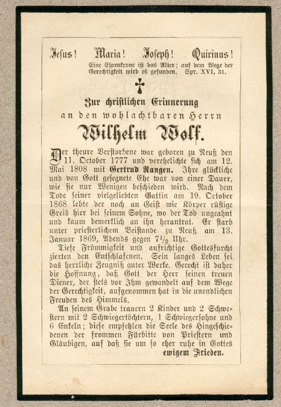 | ∞ 12.5.1808 Gertrud Rangen, † 19.10.1868; als Witwer lebte er bei seinem Sohn; 2 überlebende Kinder |