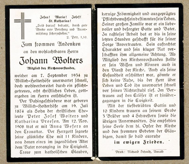 | Mitgl. Kirchenvorstand; Eltern: Peter Josef Wolters u. Katharina geb. Dreesen; ∞ 12.11.1908 Anna Wefers; 11 K., davon 1 jugendl. †; |