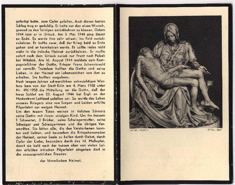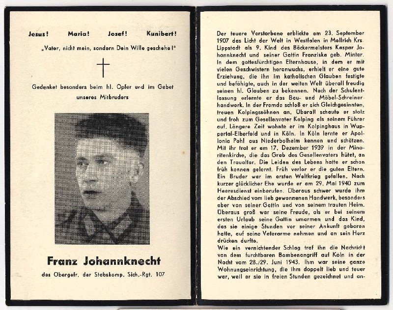 | Gefallener 2. Weltkrieg; Tod bei Fliegerangriff auf Köln in der Nacht 28./29.6.1943 seine ganze Wohnungseinrichtung zerstört; Eltern: Bäckermeister Kaspar Johannknecht u. Franziska geb. Minter; erlernte Schreinerhandwerk; wohnte im Kolpinghaus in Wuppertal-Elberfeld u. dann in Köln; ∞ 17.12.1939 Apollonia Pohl aus Niederbolheim; 29.4.1940 Einberufung; 1 K.; am 16.8.1944 b. Polozk/Witebsk vermisst gemeldet; erst 1958 kam die Nachricht von seinem Tod am 23.8.1944 |