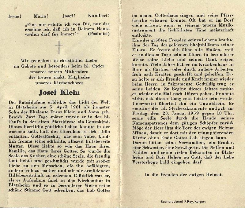 | Eltern: Franz Klein u. Anna geb. Broich; Mitgl. Kirchenchor Blatzheim; spielte Musikinstrument bei Dorffesten; viele Jahre als Gärtner im Krankenhaus Buir beschäftigt; |