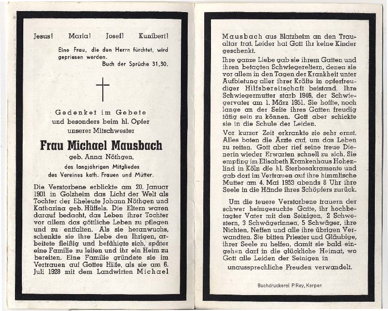 | Eltern: Johann Nöthgen u. Katharina geb. Hüffels; ∞ 6.7.1928 Landwirt Michael Mausbach aus Blatzheim; kinderlos; beerdigt in Blatzheim |
