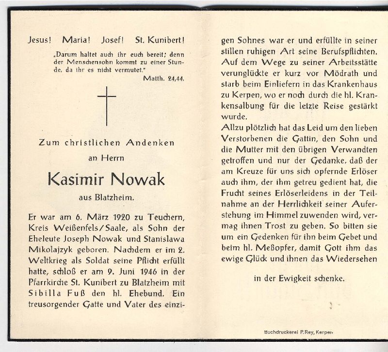 Eltern: Joseph Nowak u. Stanislawa geb. Mikolajzyk; Soldat im 2. Weltkrieg; ∞ 9.6.1946 in Blatzheim Sibilla Fuß; 1 Sohn; verunglückte auf dem Weg zur Arbeitsstätte kurz vor Mödrath; beerdigt in Blatzheim |