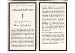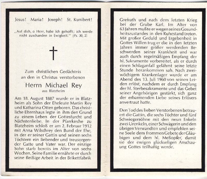 Wohnort: Blatzheim; Eltern: Martin Rey u. Katharina geb. Otten; ∞ 2.2.1912 in Blatzheim Anna Wilschrey; 6 Töchter; 1 Sohn † mit 6 Wochen; beschäftigt in der Brikettfabrik Grefrath, nach dem Krieg bei der Grube Karl; mit 63 J. wegen gesundheitl. Probeleme Ruhestand; in den letzten Jahren größer werdende Probleme seiner Krankheit |