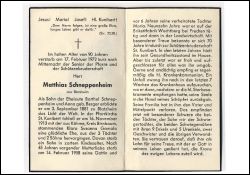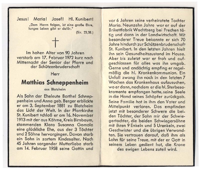 Tod nach Unfall u. 7 Wochen Krankenhausaufenthalt; Eltern: Barthel Schneppenheim u. Anna geb. Berger; ∞ in Blatzheim 16.11.1913 Susanna Gomola aus Kähme, Kr. Birnbaum, † 14.2.1948; 5 K., davon 1 früh †, verheiratete Tochter Maria † ca. 1949; 19 J. auf der Brikettfabrik Wachtberg b. Frechen tätig, danach in der Landwirtschaft; 70 J. Mitgl. Schützenbruderschaft St. Kunibert; Wohnort Blatzheim |