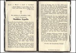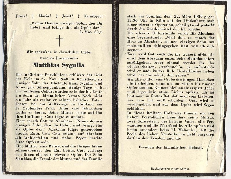 Tod nach schwerer Operation; Eltern: Emil Sygulla u. Anna geb. Schneppenheim; 2 Schwestern; Vater Emil Sygulla am 17.9.1941 im 1. Weltkrieg in Russland gefallen; beerdigt in Blatzheim |