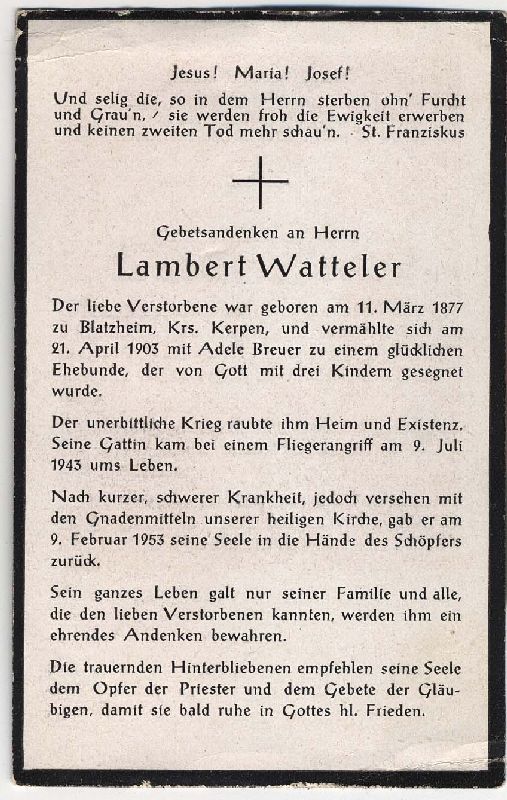 ∞ 21.4.1903 Adele Breuer; 3 K.; der 2. Weltkrieg raubte Heim u. Existenz; seine Gattin starb bei Fliegerangriff am 9.7.1943; beerdigt in Blatzheim |